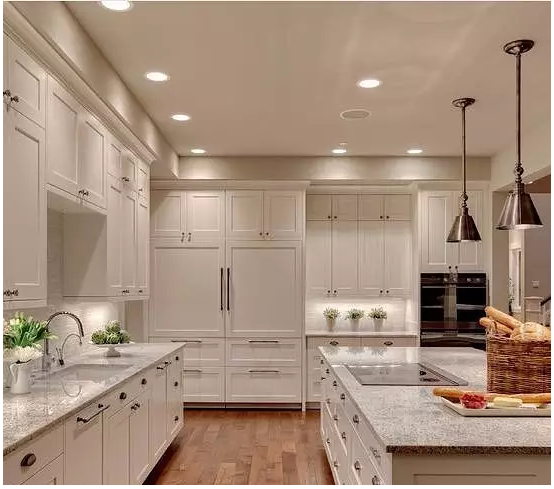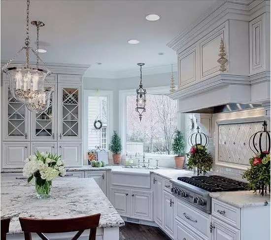 所以,如果櫥柜做到頂要滿足空間感及美觀的一般是廚房空間比較大,甚至是開放式廚房,設(shè)計(jì)層次感較多,相對復(fù)雜一點(diǎn),并且很少會有現(xiàn)代風(fēng)格的,如下圖: